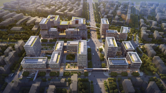 本项目按照“小街区、密路网”的总体规划,建筑总图采用围合式布局方式,建筑风格与周边建筑相协调。由于项目设计阶段未明确具体的入驻单位,因而在设计阶段对于办公和会议等使用空间做了标准化模块化的预留设计,避免将来入驻单位明确后较大的拆改。